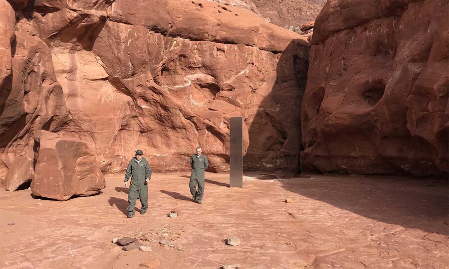 Một cột kim loại hình tam giác cao khoảng 3,6m, được ghép từ ba tấm thép không gỉ, bị chôn vùi trong lớp đá đỏ ở sa mạc phía nam Utah. Các quan chức địa phương đã tìm thấy nó ở khu vực này vào ngày 18 tháng 11 khi họ đang đếm cừu bằng máy bay trực thăng. .