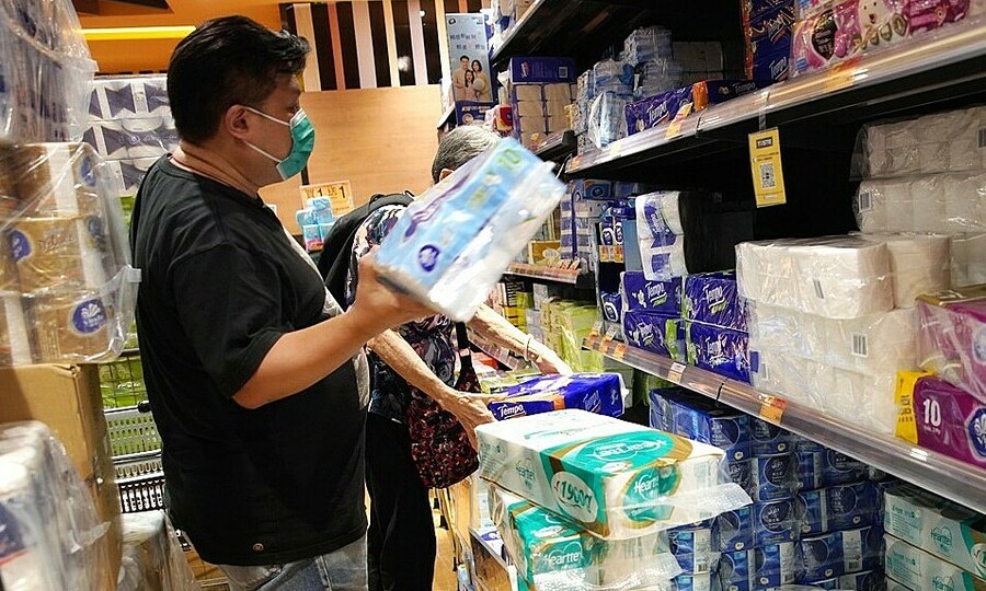 Một người đàn ông đã chọn mua giấy vệ sinh ở siêu thị ở Hồng Kông vào ngày 14 tháng 7. Một phát ngôn viên của PARKnSHOP cho biết, nhu cầu của họ đối với một số sản phẩm mới nhất đang tăng lên và đã hạn chế mua ít nhất 10 mặt hàng, bao gồm gạo, trứng, giấy vệ sinh, thuốc tẩy, thuốc khử trùng tay và các sản phẩm khử trùng. .