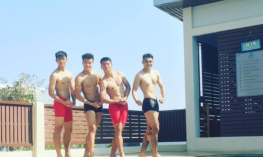 Ngoài tài năng và sự chịu chi, các cầu thủ Việt Nam thường gây ấn tượng với người đối diện bởi vóc dáng chuẩn và thân hình hoàn hảo. — Thủ môn Pei Tianshi (trái) cao 1,81 m, nặng 75 kg khiến nhiều người ghen tị. Trên trang cá nhân, anh thoải mái đăng ảnh khoe cơ bụng 6 múi cùng đồng đội.