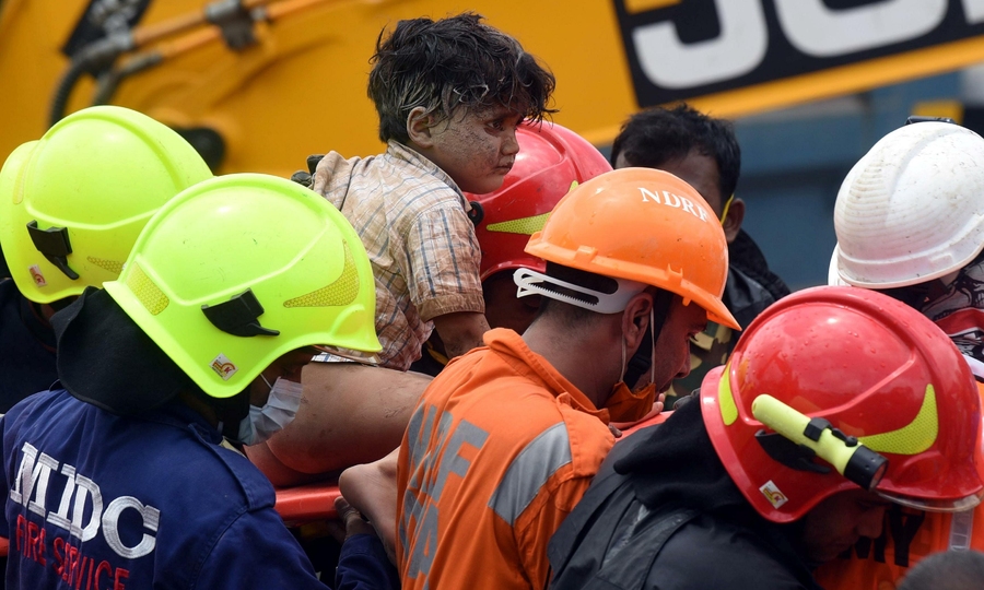 Một cậu bé 4 tuổi đã được cứu khỏi một tòa nhà bị sập ở thị trấn Mahah, miền nam Mumbai vào ngày 25 tháng 8. Ảnh: Reuters .- — Các quan chức nói rằng nhiều người sống trong 47 căn hộ đã trở về nhà để tránh dịch Covid-19. Khi tòa nhà bắt đầu rung chuyển, hàng chục người đã nấp sau thoát thân kịp thời.