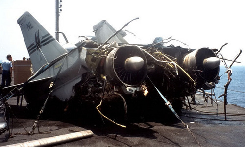 F-14A bị rơi, số 162602, phi hành đoàn bao gồm Thuyền trưởng” Lợn “Arnold và” Động vật “Thiếu tá Jennings. Phi công tiếp cận tàu sân bay và bắt đầu thủ tục hạ cánh bình thường.